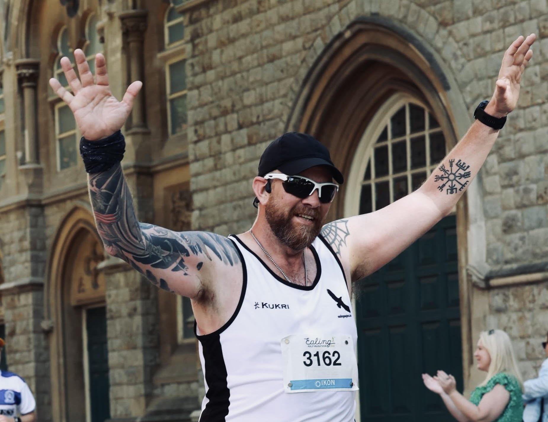 In the last video call with Jenny she had shown me where the cheer squad would be on street view, I knew the area well from my photography days. I could see the foot bridge across the road from where I was, it all meant there was just a little over three miles to the finish! Ping! Hamstring went again and for a second time I hobbled to a walk. More than just tired muscles? I walked a little and then the Eagle’s flag came into view. I had to run past this point. I gritted my teeth and started up the run again and it was all good to begin with, as I got to the line of familiar faces in the crowd all cheering I dug deep and found everything I could to keep smiling, to keep running, push any discomfort down and out of my mind. In truth I was working out when I could walk again and rest this damn pain.